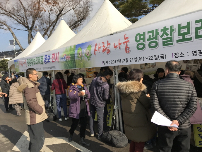 영광군과 영광찰보리6차산업화추진단은 연말연시를 앞두고 지난 21일부터 22일까지 이틀간 영광군청 광장에서 우리 지역에서 생산되는 찰보리 가공제품을 보고, 먹고, 구입할 수 있는 ‘사랑나눔 영광찰보리 홍보전시장’을 운영하였다.