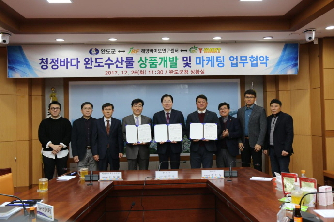 이날 협약에 따라 완도군과 해양바이오연구센터, Y-마트는 완도군 청정해역에서 생산되는 다양한 해양자원을 이용한 제품개발과 마케팅, 판매 촉진 활동에 나선다.
