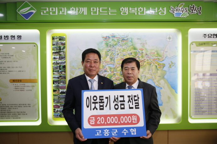 지난 26일 고훙군수산업협동조합(조합장 이홍재)은 보성군을 방문해 이웃돕기 성금 2천만 원을 기탁하며 지역사회에 온정을 전했다.