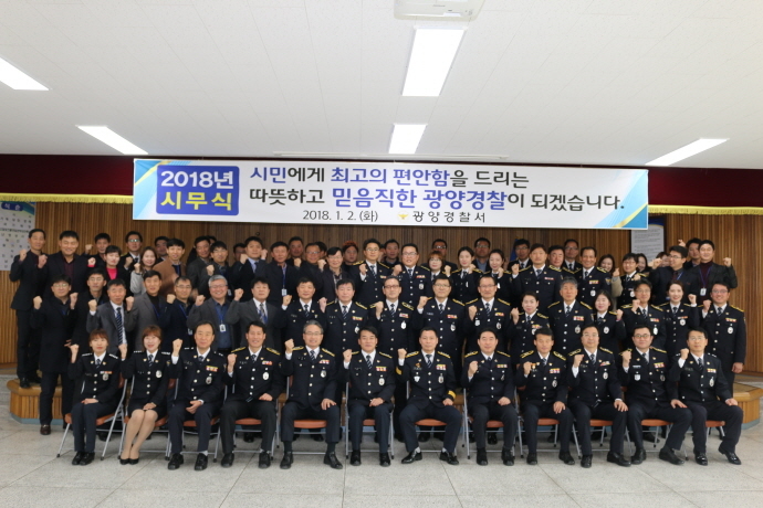 광양경찰서(서장 박종식)는 2일 청사 4층 백운마루에서 경찰서장 및 全 직원이 참석한 가운데 2018년 새해 업무를 알리는 시무식을 개최했다.