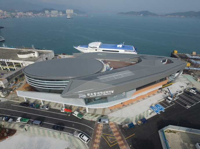 바다를 향해 비상하는 선박의 힘찬 이미지를 형상화한 신축 터미널 건축물은 지상 2층으로 연면적 4,785㎡의 철근, 철골조를 기반으로 최신식 시설을 갖춘 첨단여객터미널로 조성됐다.