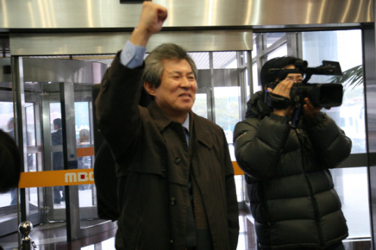 | ▲ 엄기영 강원도지사 후보가 MBC 사장직을 사퇴하며 나오는 도중 농성중인 MBC 후배들을 향해 "MBC 화이팅"을 외치고 있다. ⓒ양정철닷컴 |