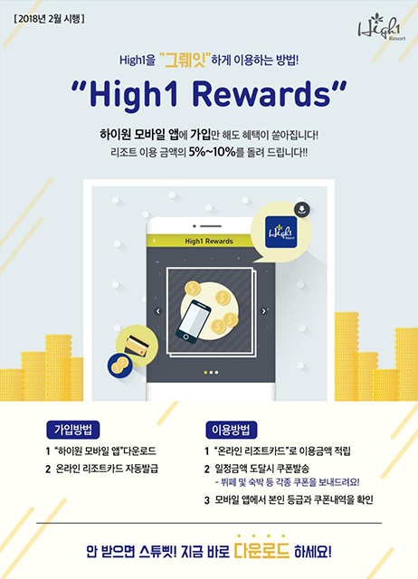 리워즈 프로그램에 참여를 원하는 고객은 하이원 모바일 앱을 통해 온라인 리조트 카드를 발급받아 이용실적을 적립하면 된다.