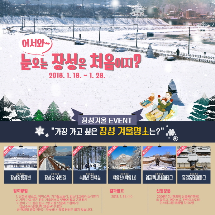 장성군 공식 네이버 블로그와 SNS(페이스북, 카카오스토리, 인스타그램)은 오는 28일까지 ‘가보고 싶은 장성 겨울 명소’를 주제로 이벤트를 열고 참여자 중 200명을 선정해 1만원 상당의 편의점 상품권을 지급한다.