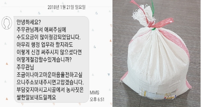 해당 민원인은 광양시와 이 주무관의 적극적인 행정 결과 수도요금 절감 해택을 받은 감사의 마음을 전하고자 본인이 직접 농사를 지어 수확한 쌀을 보내고 싶다는 뜻을 전해왔었다.
