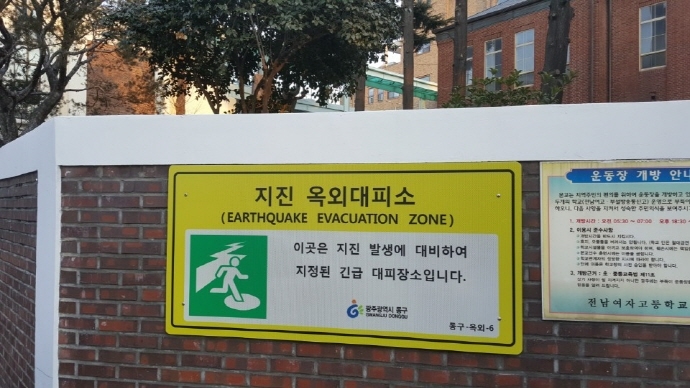 광주시는 재해구호기금 등 1억5000여 만원을 투입해 지난해 8월부터 야간에도 쉽게 식별할 수 있는 형광반사지 재질의 안내표지판을 제작했으며, 지진대피소 입구 외벽 등 눈에 잘 띄는 곳에 설치했다.