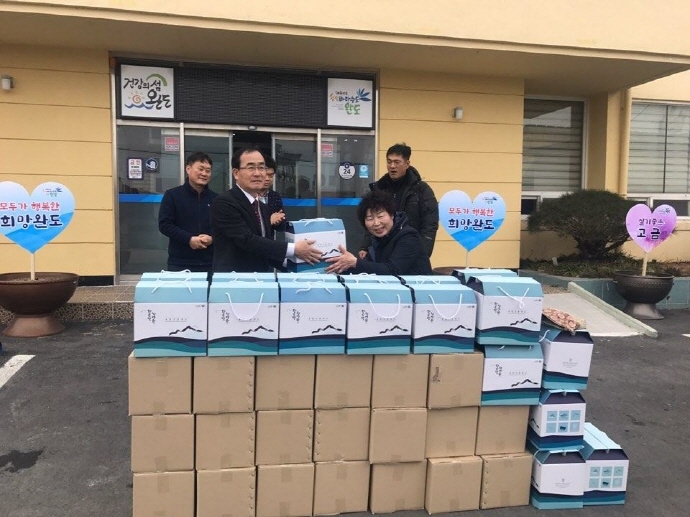 (주)청해진미 장애순 대표는 2일 완도군 고금면사무소를 찾아 설 명절을 앞두고 관내 소외되고 어려운 세대를 위해 해조류세트(500만원 상당) 100박스를 전달했다.