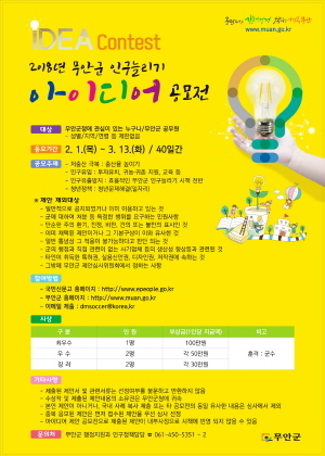 군 관계자는 “인구증가에 대한 군민의 참여와 관심도를 높이고 정책의 수요자인 군민들이 필요로 하는 정책을 군정에 반영하기 위해 아이디어 공모를 실시하게 됐다”며 “군민들의 관심과 적극적인 참여를 바란다”고 당부했다.