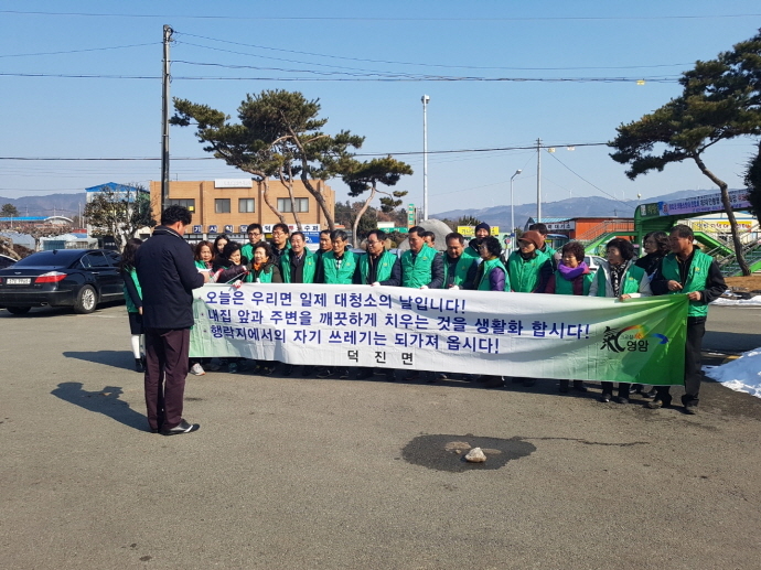 덕진면 문진규 면장은 “추운날씨에도 불구하고 오랜만에 우리 지역을 찾는 귀성객들에게 청정한 이미지를 남겨줄 수 있도록 설맞이 대청소에 적극적으로 협조해주신데 감사의 말씀을 드리고 특히, 2018년은 영암방문의 해 및 제 57회 전남도민체전이 있어 우리 지역을 관광객 등 외지인이 많이 찾을 것을 예상하여 평소에도 깨끗한 지역 만들기에 앞장서주시길 당부 드린다.”며 깨끗한 지역이미지 제고에 최선을 다할 것을 다짐했다.