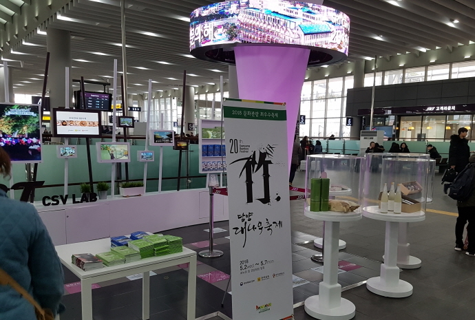 ‘2018 담양 방문의 해’ 및 제20회 담양대나무축제 홍보와 대숲맑은 담양쌀, 천년담주, 대잎차, 한과, 전통장 등 담양 농특산물을 전시해 수서역을 찾은 많은 사람의 이목을 끌었다.