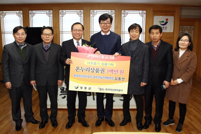 한국자산관리공사 광주전남본부(본부장 김동언)는 지난 12일 장흥군(군수 김성)에 설명절 사회복지시설에 사용해 달라며 300만원 상당의 성품을 기탁하였다.
