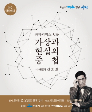여수시에 따르면 오는 23일 오후 3시 진남문예회관에서 ‘가상과 현실의 중첩’을 주제로 여수아카데미 시민교양강좌가 열린다.