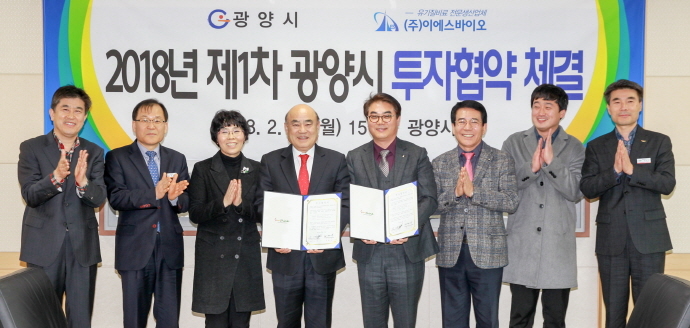 광양시는 지난 19일 시청 시민접견실에서 지역 업체인 이에스바이오 농업회사법인주식회사(이하 ㈜이에스바이오)와 ‘2018년 제1차 투자협약(MOU)’을 체결했다고 밝혔다.
