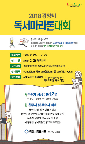 독서문화진흥과 시민들의 독서습관 생활화를 위해 올해로 5회째 개최되는 이번 대회는 마라톤 경기에 참여하듯 꾸준히 책을 읽고, 목표 코스를 완주하면 되며, 책 1쪽은 마라톤 1m로 환산된다.