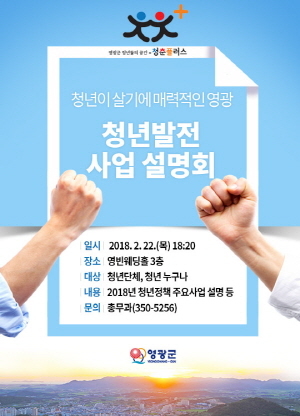 이번 설명회에서는 청년발전 기본계획 수립배경, 2018년에 추진되는 청년정책 주요사업 중 일자리 정책 사업과 청년복지·청년참여를 위한 다양한 사업을 설명할 계획이다. 청년정책 사업에 관심 있는 청년이면 누구나 참석 가능하다.