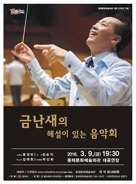 최성규 동해시 공보문화담당관은 “금난새 지휘자의 해설이 있는 연주회는 쉽고 재밌는 해설로 관객들에게 꾸준한 호평을 받고 있으며 전회 전석 매진을 기록하고 있는 인기 음악회 중 하나이므로 많은 시민의 관람을 바란다”고 말했다.