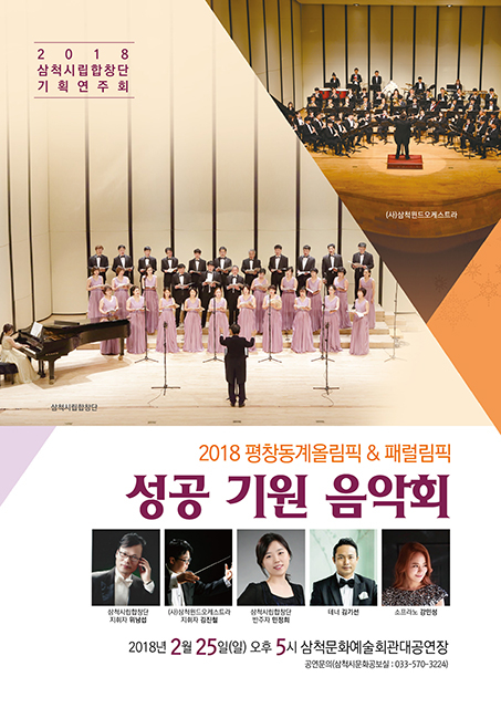 ‘2018 평창동계올림픽&패럴림픽 성공기원 음악회’가 오는 25일 오후 5시 강원 삼척문화예술회관 대공연장에서 정월대보름제의 대미를 장식한다.