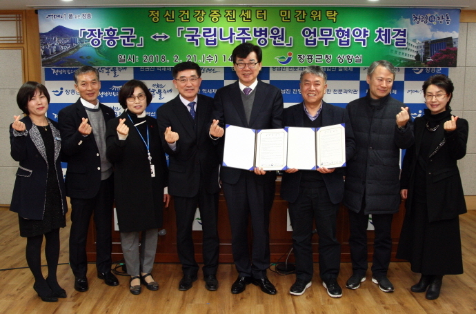 장흥군(군수 김성)은 지난 21일 군청 상황실에서 국립 나주병원과 정신건강복지센터 위탁운영 협약을 체결했다고 밝혔다.