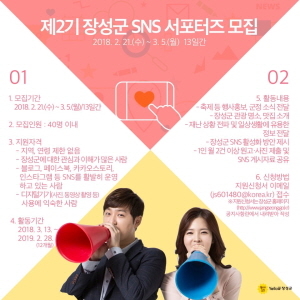 장성군은 앞으로 일년 동안 블로그나 SNS를 통해 장성군의 관광자원이나 축제, 맛집 등 다양한 정보를 전달해 줄 ‘제2기 SNS 서포터즈’를 3월 5일까지 모집중이라고 밝혔다.