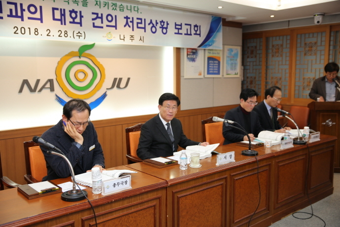 소관부서별 추진 현황을 청취한 강인규 나주시장은 “주민의 목소리를 통한 건의사항은 반드시 지켜야할 소중한 약속”이라며, “늘 시민의 눈높이와 입장에서 바라보고, 불편사항 하나하나에도 결코 소홀함 없이 빠르게 해소될 수 있도록 각자 최선을 다해주길 바란다”고 당부했다.