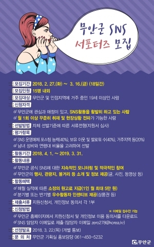 모집대상은 무안군에 대한 애정과 관심을 갖고 SNS 활동을 활발히 하고 있는 19세 이상인 사람이면 누구나 지원할 수 있으며, 지원방법은 군청 홈페이지에서 신청서를 다운로드 받아 담당자 이메일로 제출하면 된다.