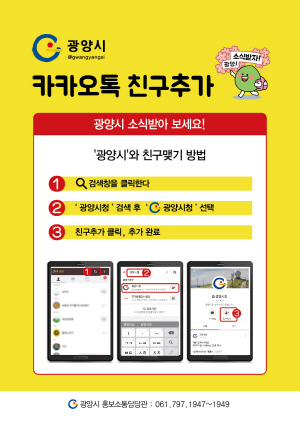 광양시청 카카오톡의 소식을 받고자 하는 시민은 스마트폰 어플 카카오톡을 실행 후 ‘광양시청’을 검색해 친구 추가하면 된다.