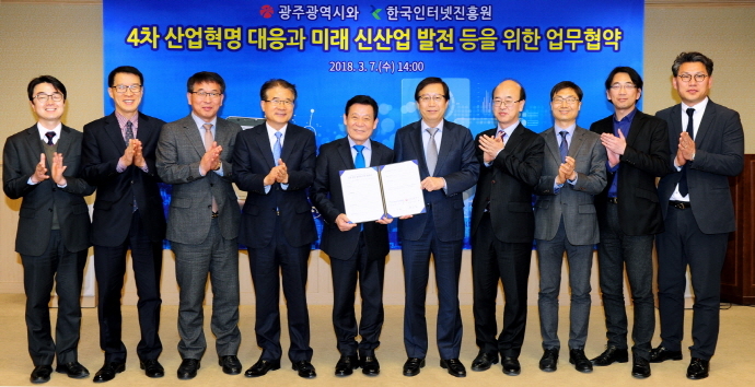 광주광역시는 한국인터넷진흥원(KISA·원장 김석환)와 7일 시청 3층 비즈니스룸에서 4차 산업혁명 대응과 미래 신산업 발전 및 지역사회공헌 기반강화를 위한 업무협약을 체결했다.