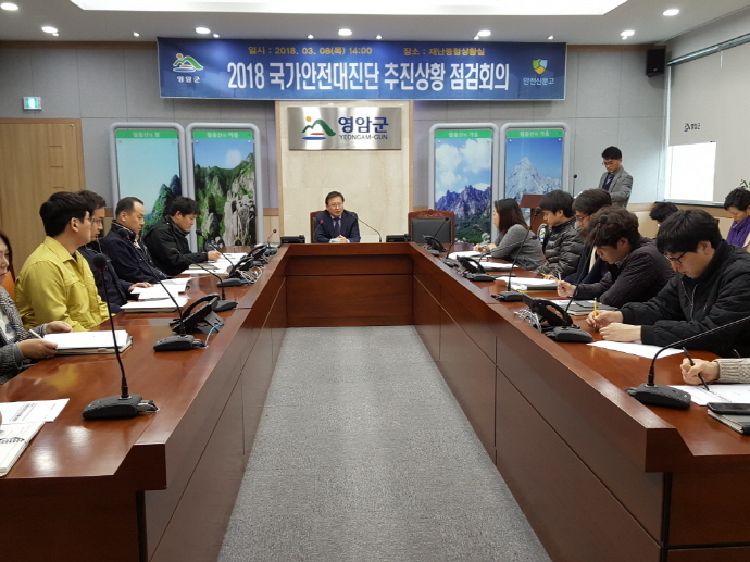 영암군(군수 전동평)은 3월 8일 황인섭 부군수 주재로 2018년 국가안전대진단 추진상황 점검회의를 개최하였다. 이번 회의에서는 해당부서별로 군민들의 안전을 위해 추진 중인 사항과 대책에 관하여 논의하였다.