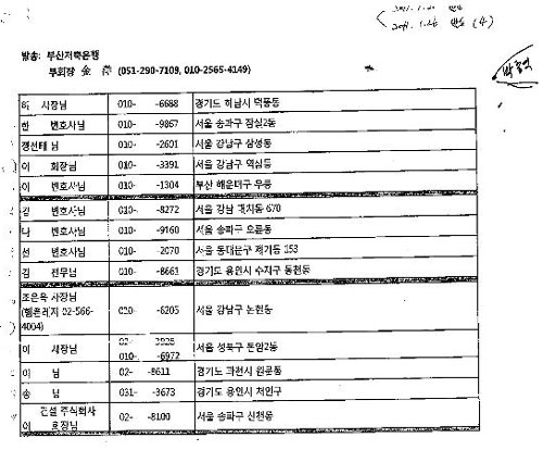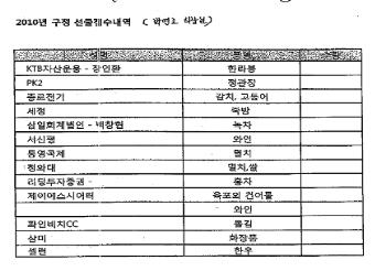 | ▲ 부산저축은행의 선물 전달자 명단. 정선태 법제처장 이름이 적혀 있다. ⓒ우제창 의원실 |