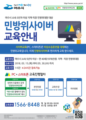 15일 여수시에 따르면 이달 15일부터 5월 30일까지 사이버 민방위교육이 실시된다.
