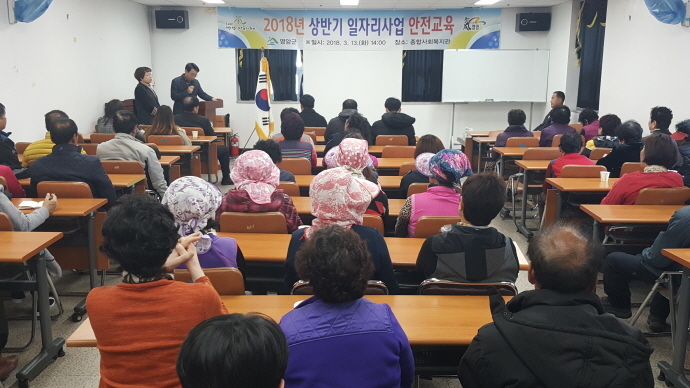 영암군(군수 전동평)은 지난 13일 영암군 종합사회복지관에서 2018년 상반기 공공근로·지역공동체 일자리사업대상자와 테크노폴리스 현장 기간제 근로자 및 사업담당 공무원 등 120명을 대상으로 안전보건교육을 실시했다고 밝혔다.