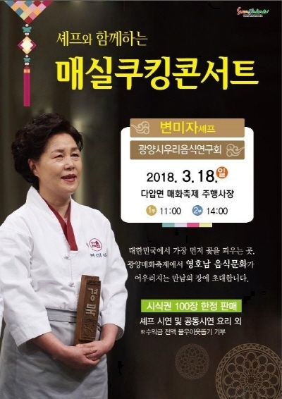 이어, 오는 3월 18일 오전 11시와 오후 2시에 한식대첩4 최종우승자인 경북 대표 변미자 셰프를 초청 ‘셰프와 함께하는 매실쿠킹콘서트’를 개최해 영호남 음식문화가 서로 융합되는 만남의 장을 마련한다.