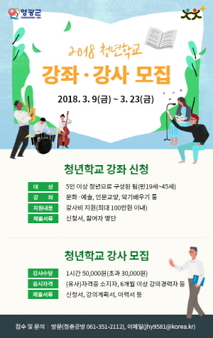 모집기간은 오는 23일까지이며 청년으로 구성된 팀이면 누구나 신청이 가능하다. 청년 활력사업 신청자는 사업별 제출서류(신청서, 동아리 소개서, 청년학교 참여자 명단 등)를 작성하여 청춘공방이나 이메일로 제출하면 된다.