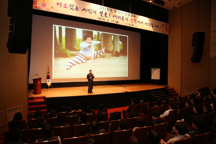 또 “공무원 한 명이 나주시 공직사회 전체 이미지를 결정한다”며, 공무원 개개인의 책임감을 강조한 조 강사는 “미소 짓는 시민의 얼굴은 공직자 여러분의 친절에서 시작된다”고 말하며, 평소 주민에 대한 애정과 관심을 가져줄 것을 주문했다.