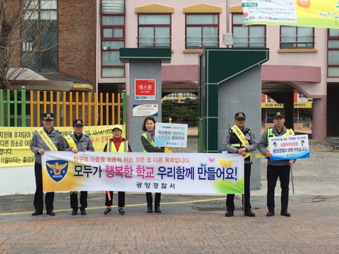 광양경찰서 읍내지구대(대장 송승희)는 20일 오전 7시 50분부터 8시 30분까지 광양시 광양읍 서초등학교 앞에서 학교폭력이 다수 발생하는 신학기 초 적극적인 맟춤형 활동을 통한 선제적 학교폭력예방 캠페인을 실시했다.