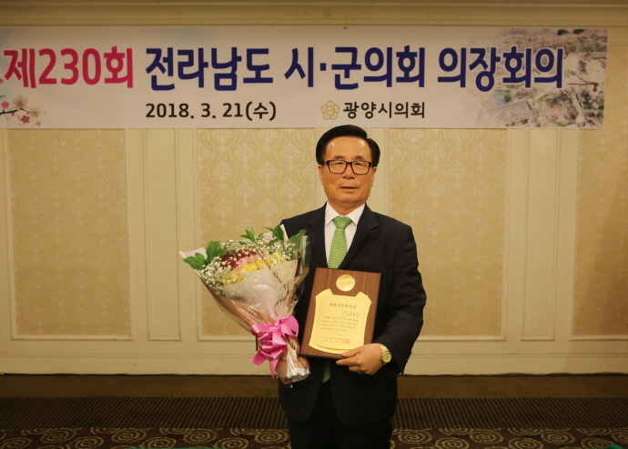 영암군의회 박영배 의장은 지난 3월 21일 전남시군의회 의장회 정기회의에서 지방자치 발전에 기여한 공로로 전국시군자치구의회 의장 협의회(회장 이환설)로부터 지방의정봉사상을 수상하는 영예를 안았다.