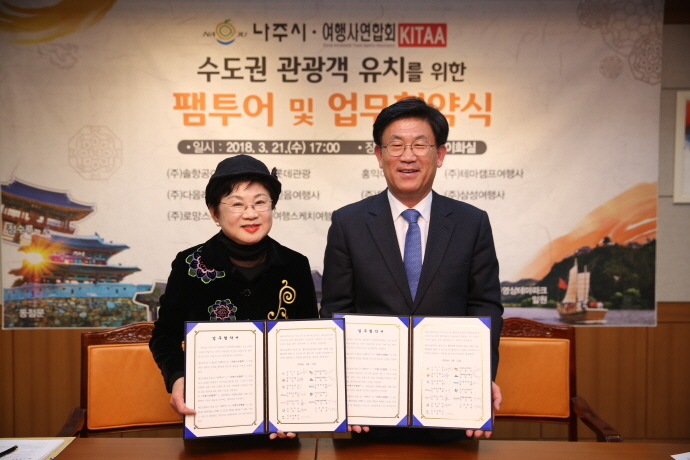 시는 ㈜솔항공여행사 등 12개 여행사 대표 및 관계자들과 협약식을 갖고 수도권 관광객 유치 공동마케팅, 1박2일 관광체험 상품 발굴 등 나주 관광산업 활성화를 위한 프로그램 개발․운영에 상호협력해가기로 했다.