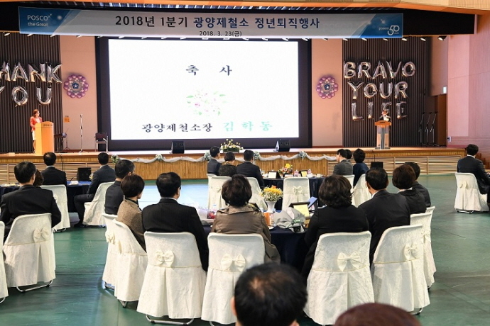 포스코 광양제철소(소장 김학동)가 23일, 올해 첫 분기 정년퇴임식을 개최했다.
