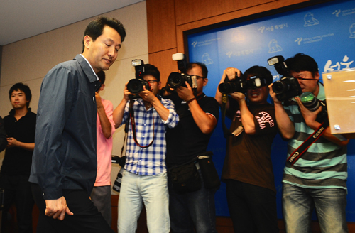 | ▲ 기자회견을 위해 단상에 오르는 오세훈 서울시장 ⓒ뉴시스 |