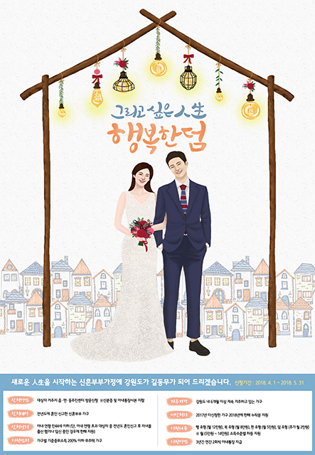 지원대상은 아내연령이 만44세 이하며 전년도에 혼인신고를 마친 신혼부부로, 신청 일을 기준으로 도내 6개월 이상 계속해 거주하고 있는 기준중위소득 200%이하 무주택 가구다.
