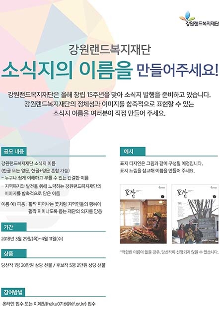 강원랜드복지재단(이사장 한형민)이 창립 15주년을 맞아 재단의 다양한 지역복지 관련활동을 전하는 소식지를 발행하기로 하고 제호를 공모한다고 30일 밝혔다.