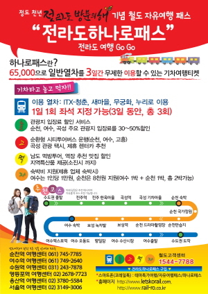 하나로패스는 개인화와 웰빙의 가치를 중요시 여기는 여행트랜드에 맞춰 일반열차를 이용하여 3일간 전국을 자유롭게 여행할 수 있는 코레일의 대표적인 자유여행패스이다. 코레일 전남본부는‘2018년 전라도방문의 해’를 기념하여 전라도 3개 광역시와 업무협약을 체결하고 남도의 천혜 관광지를 만끽할 수 있는 전라도하나로 패스를 연말까지 판매하기로 하였다.