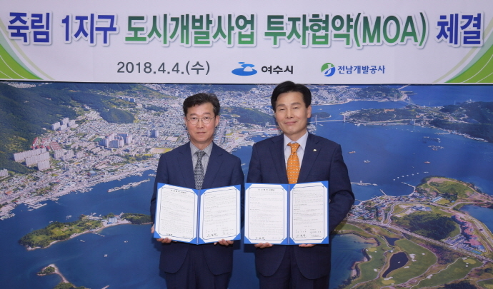 4일 여수시에 따르면 이날 오전 시청 시장실에서 주철현 여수시장과 한병선 전남개발공사 사업본부장이 죽림1지구 택지개발 투자협약을 체결했다.