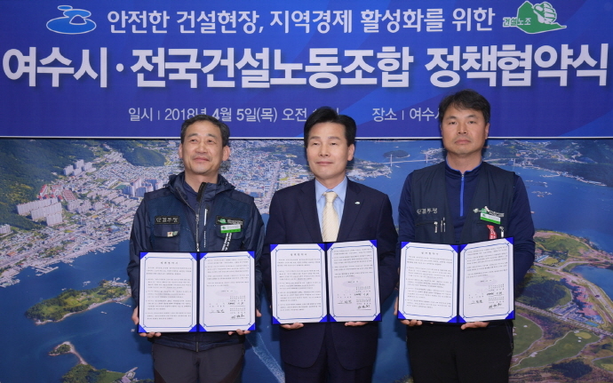 시와 노동조합에 따르면 5일 오전 10시 주철현 여수시장은 집무실에서 광주전남건설지부 남상배 지부장, 광주전남건설기계지부 정양옥 지부장과 근로자 권리보호와 안전한 건설현장, 고용안정, 지역경제 활성화를 위한 정책협약을 체결했다.
