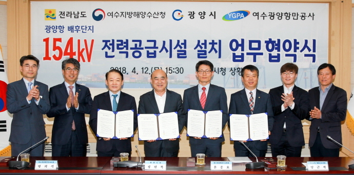 시는 4월 12일 시청 상황실에서 광양시, 전라남도, 여수지방해양수산청, 여수광양항만공사 등 4개 기관이 참여한 가운데 광양항 배후단지 내 154kV 전력공급시설 설치를 위한 업무협약식을 가졌다고 밝혔다.