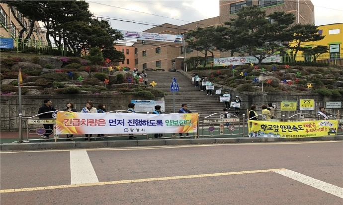 참석자들은 현수막, 어깨띠를 활용해 운전자 신호와 속도준수, 스쿨존 주정차 금지 등 어린이 교통안전사고 예방을 위한 홍보활동을 대대적으로 펼쳤다.