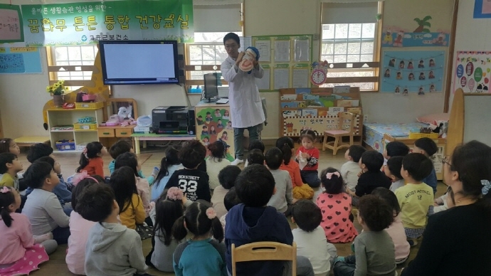 꿈나무 튼튼 건강교실은 보건소 치과공중보건의, 운동처방사 그리고 영양사가 한팀을 이루어 관내 유치원과 어린이집을 방문하여 구강검진과 불소도포, 유아운동 그리고 영양교육을 실시하는 프로그램이다.