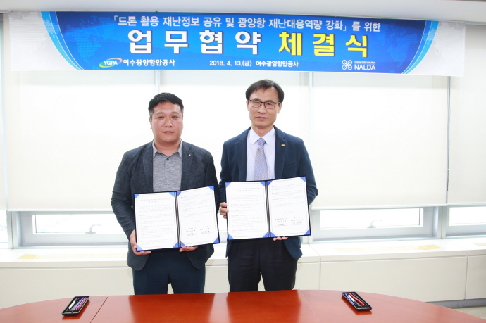 공사는 이날 월드마린센터에서 전남 동부권 유일한 국토교통부 지정 드론 교육기관이며 드론 연구개발업체인 ㈜날다(대표 강원혁)와 ‘드론 활용 재난정보 공유 및 광양항 재난대응역량 강화’를 위한 업무협약을 체결했다.