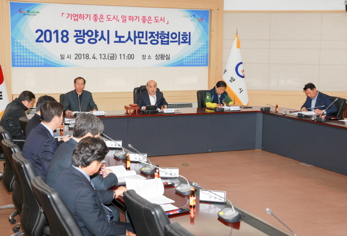 광양시 노사민정협의회(위원장 정현복)은 지난 4월 13일 시청 상황실에서 한국노총광양지역지부 김성희의장, 민주노총광양시지부 김경환 지부장 그리고 경영자대표인 이백구 상공인회장 등 16명이 참석한 가운데 정례회의를 개최했다.