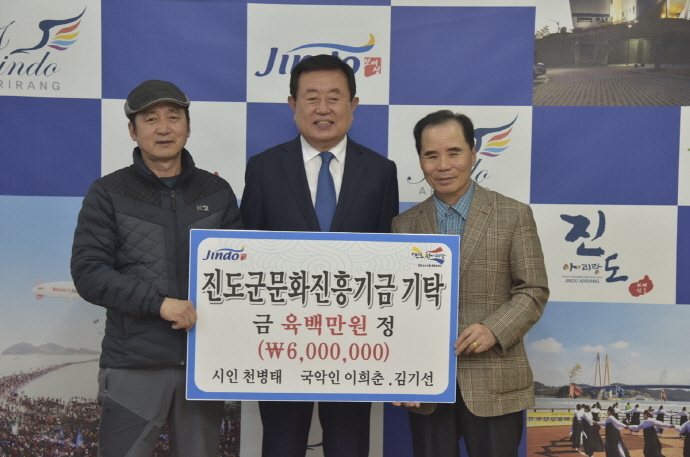 16일 진도군에 따르면 시인 천병태씨, 국악인 이희춘씨, 김기선씨 등 진도지역 문화예술인 3명이 대한민국 민속문화예술특구인 진도의 문화예술발전에 동참하기 위해 진도군 문화진흥기금으로 사용해 달라며 기금 600만원 기탁했다.